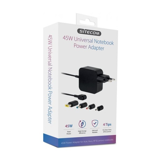 מטען אוניברסלי למחשב נייד בעוצמה של 45W מבית Sitecom. מתאים למחשבים ניידים של Acer Asus HP Lenovo ועוד .